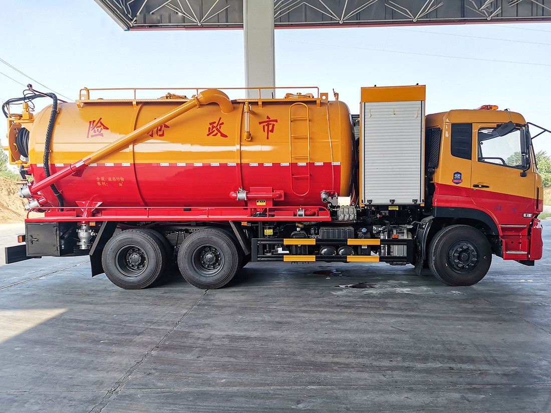 吸污部分:16方污罐,罐體8mmQ235優質碳鋼,配濰柴420副發動機帶淄博SK-42/258水循環泵,罐體內部平鋪1.2米不銹鋼底板,10米吸污管一根,進氣管加過濾網,防溢閥加高,后蓋卡扣鎖緊,前視污量管,后尾部加裝3個100mm的球閥吸污口,600mm排污口液壓開啟,150mm排污球閥,罐體帶舉升功能。